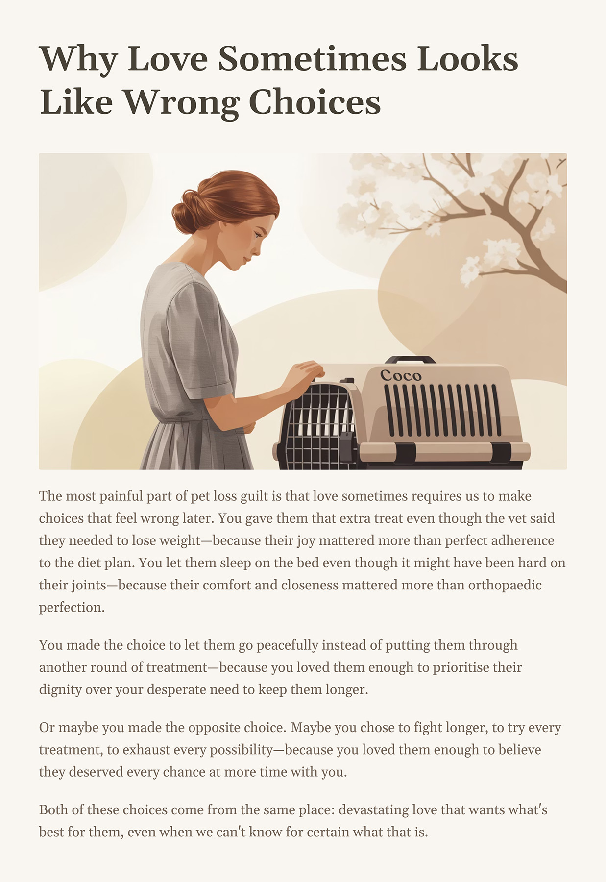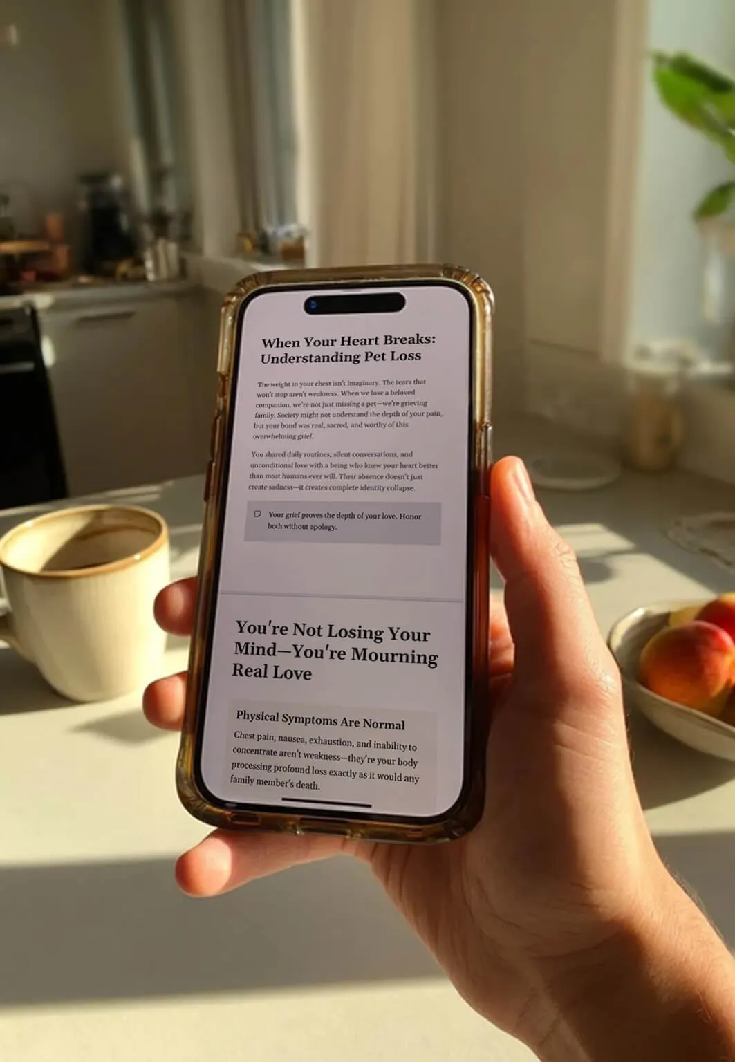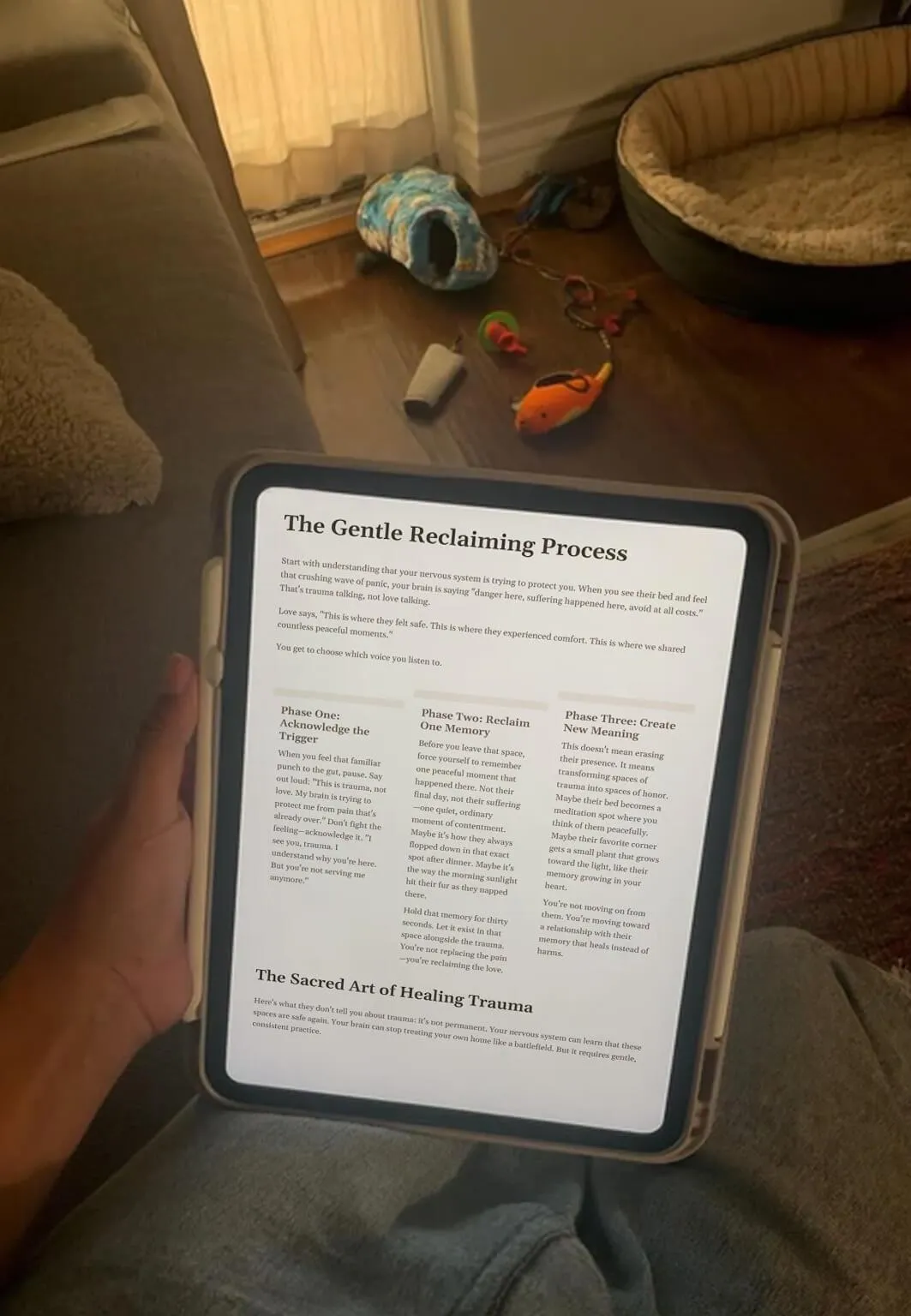 "The bonus manual about turning home triggers into soft spaces? Genius. That corner where her bed used to be now holds a tiny altar with her collar and a lavender candle. It no longer makes me cry when I walk by. Sometimes I smile :)"